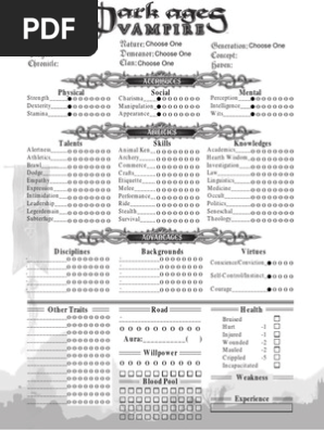 Dark Ages Vampire Editable Character Sheet 4 Pages Leisure